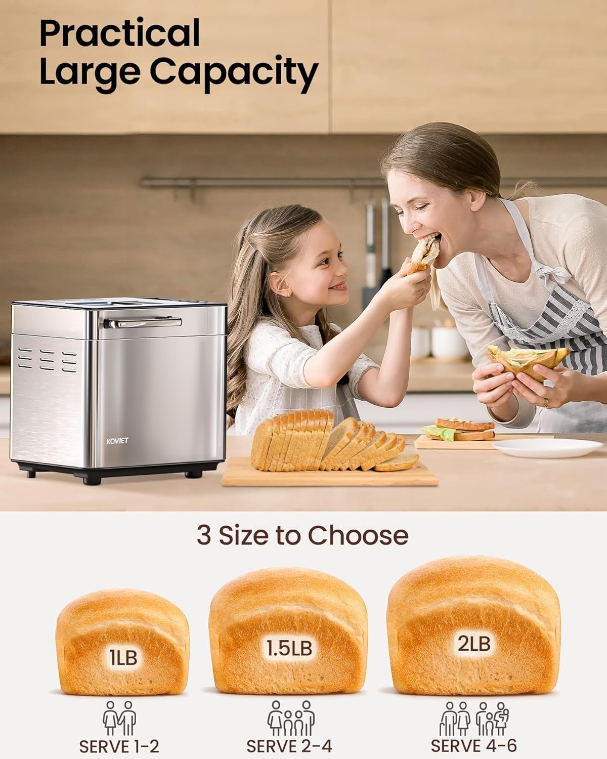 25-in-1 Bread Maker Machine with Automatic Dual Dispenser, 2LB Stainless Steel Breadmaker with Gluten-Free, Dough, Jam, Yogurt etc Settings, Silver