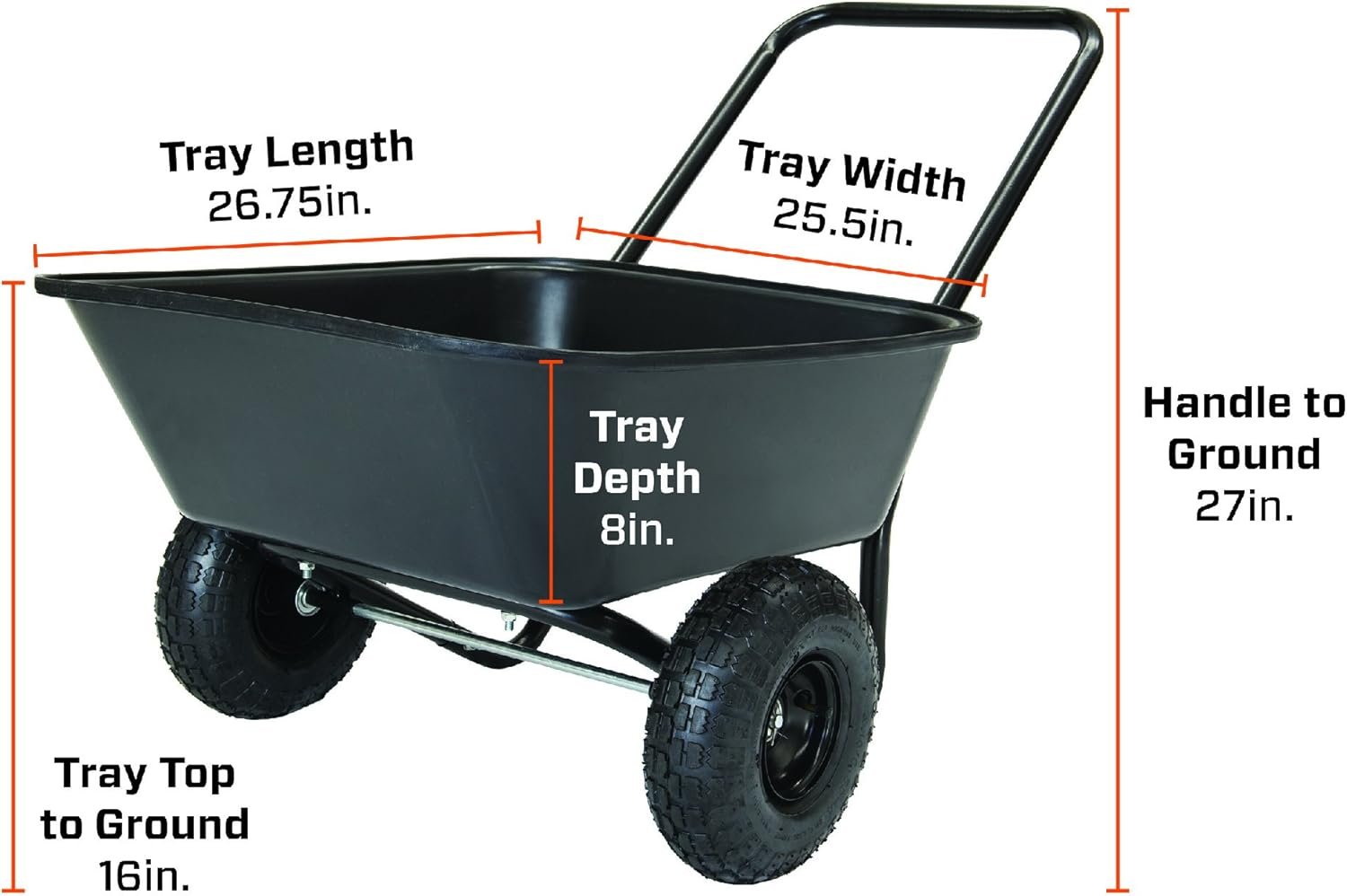 The rust-proof 4 cubic foot poly tray has a depth of 8″, load capacity of 300 pounds, and is perfect for light residential use as a wheelbarrow, yard cart or garden cart.