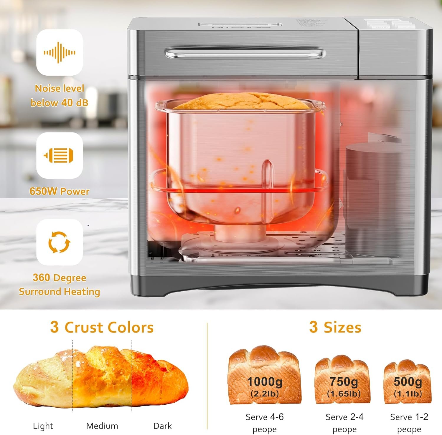 Large capacity bread machine: Kitchen in a box bread maker features a generous 2lb capacity, making it perfect for baking larger loaves for families or group gatherings. It also offers three loaf sizes (1lb, 1.5lb, 2lb) and bread machine 3 loaf crust options—light, medium, and dark—providing a fully customizable baking experience.