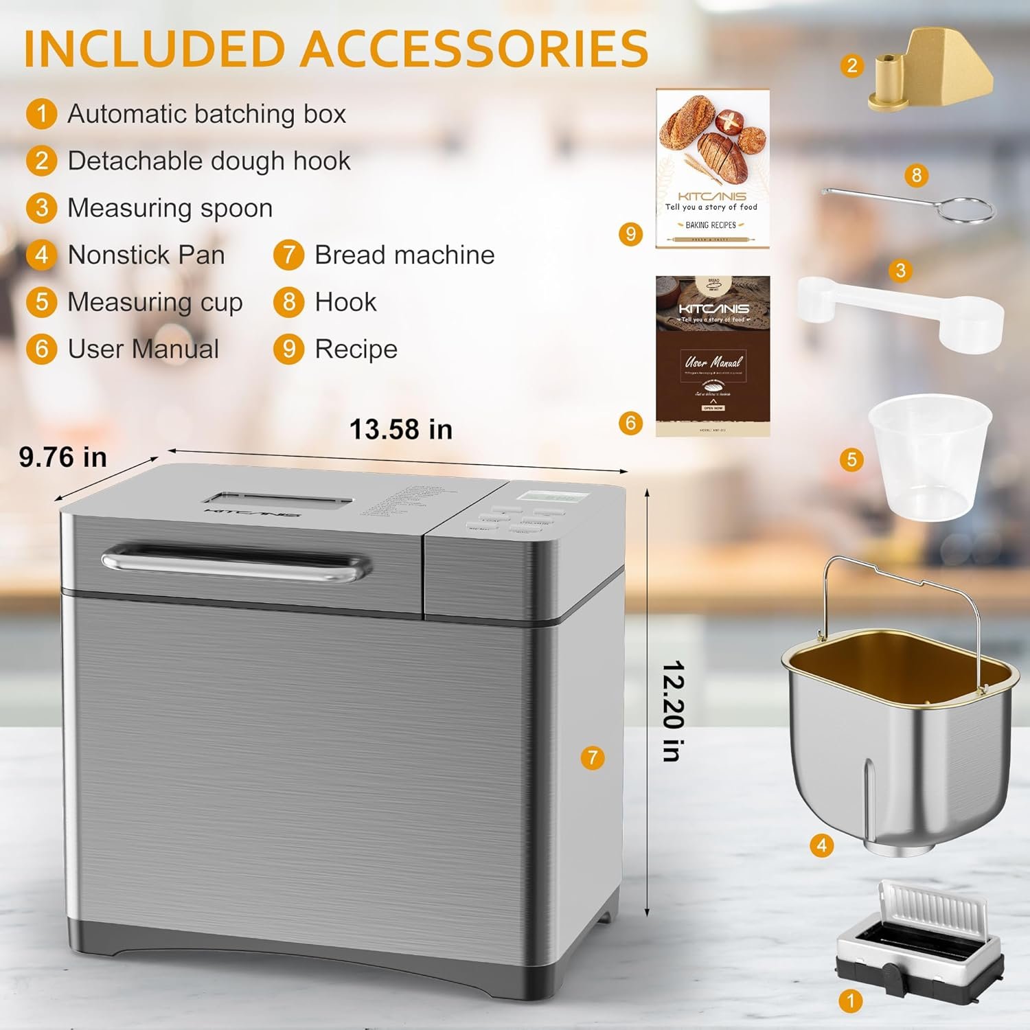 Kitcanis bread making machine offers 19 programs for bread, pizza dough, jam, and more. Easy to use, perfect for homemade goodness!