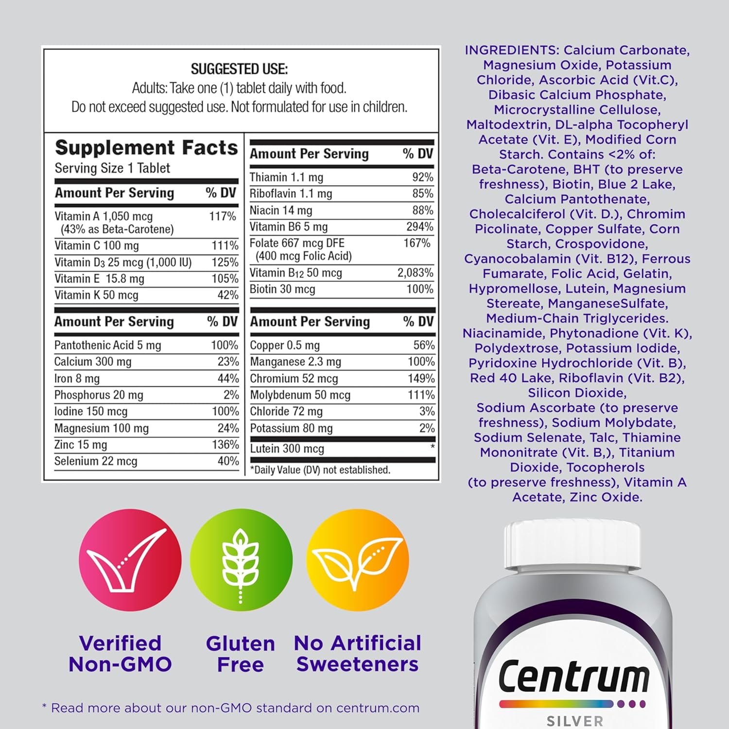 Centrum Silver Women’s Multivitamin for Women 50 Plus, Multivitamin/Multimineral Supplement with Vitamin D3, B Vitamins, Non-GMO Ingredients, Supports Memory and Cognition in Older Adults – 200 Ct