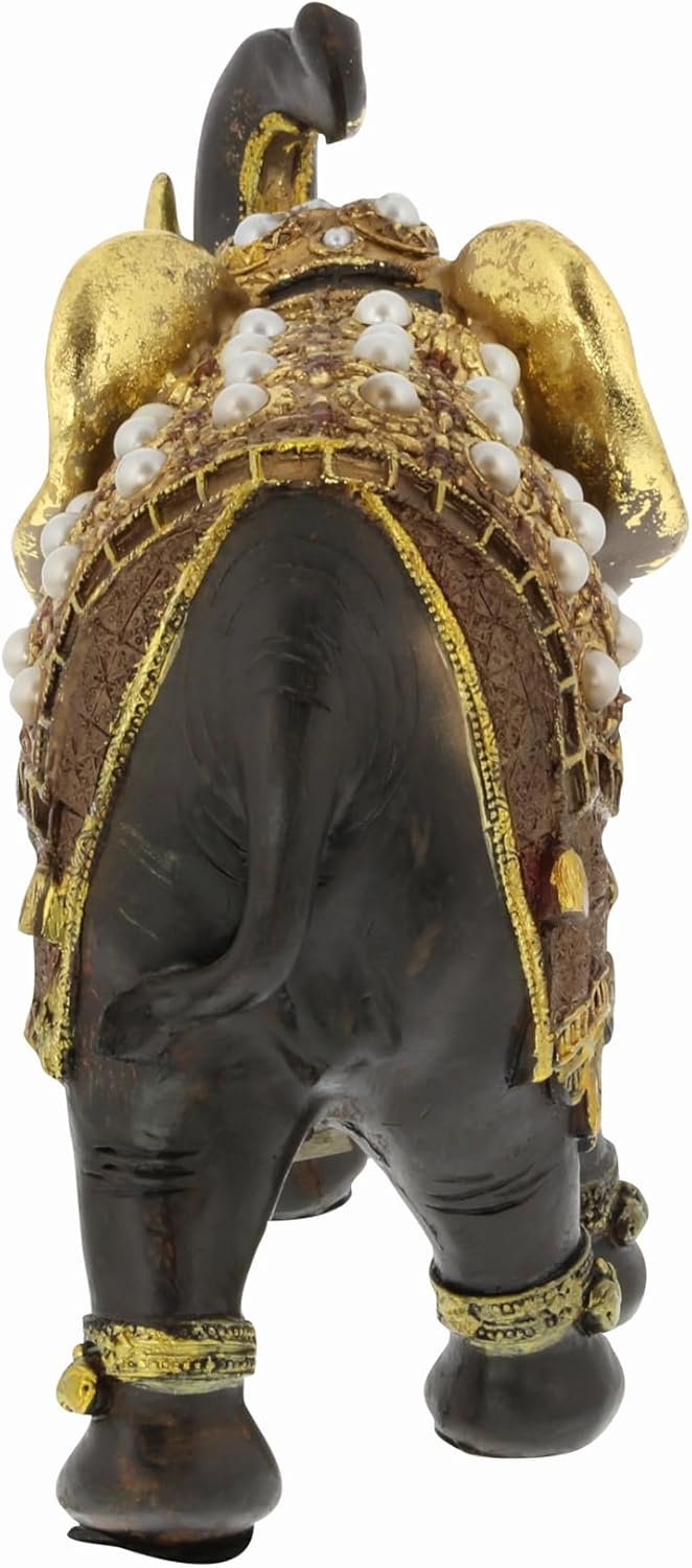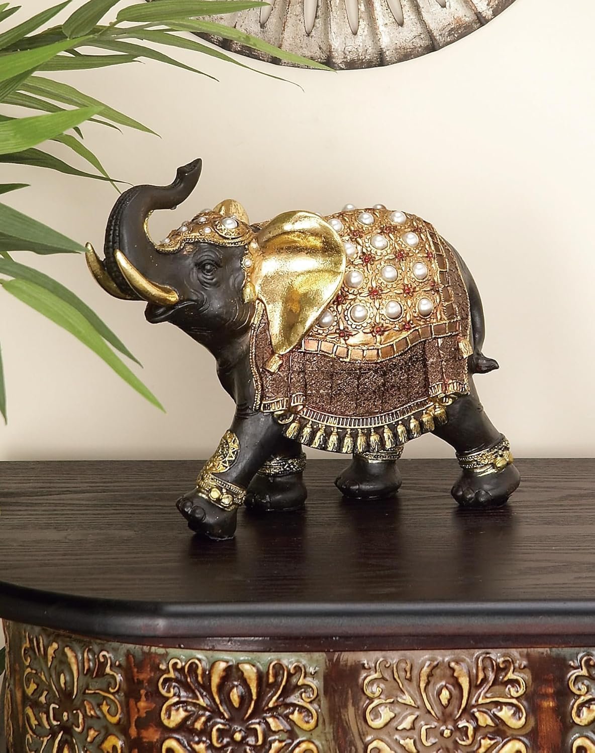 ELEPHANT ACCENT STATUE: Features pearl and rhinestone beads with fabric-textured details, sculpted with ornate traditional feet markings