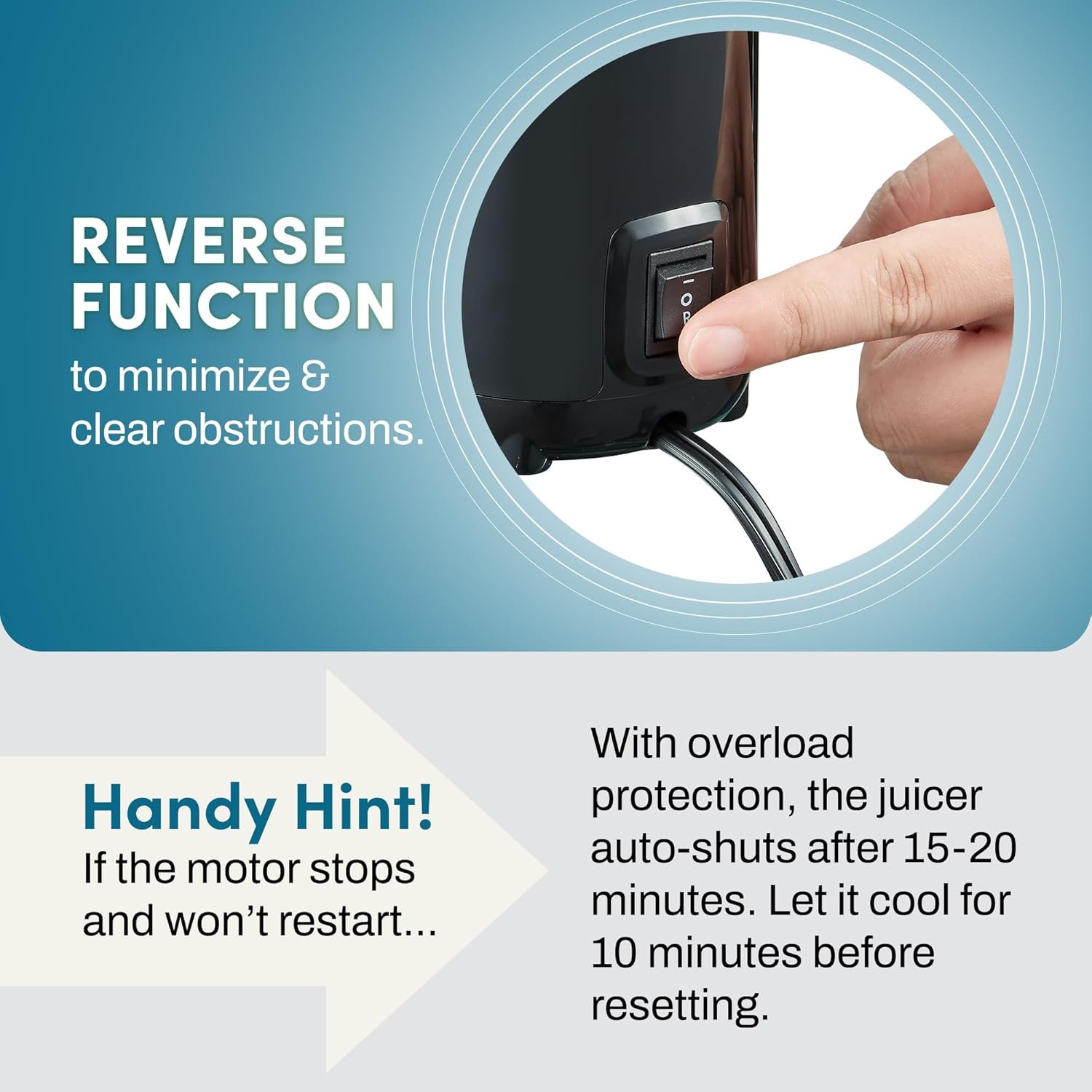 【User-Friendly Design】 This masticating juicer is designed to operate for up to 15-20 minutes continuously. It features overload and overheat protection, automatically shutting off to prevent damage. If overused, simply turn it off, wait 10 minutes to cool and reset, then restart.