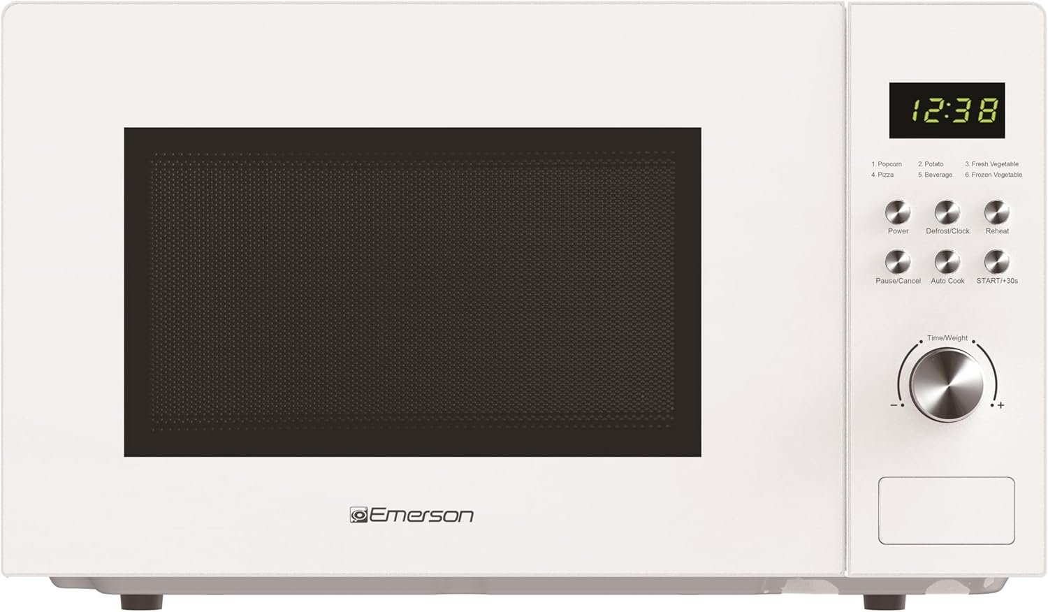 Emerson MW1101W Microwave Oven with Timer & LED Display 1000W, 10 Power Levels, 6 Pre-Programmed Settings, Removable Glass Turntable with Child Safe Lock, 1.1 Cu. Ft, White