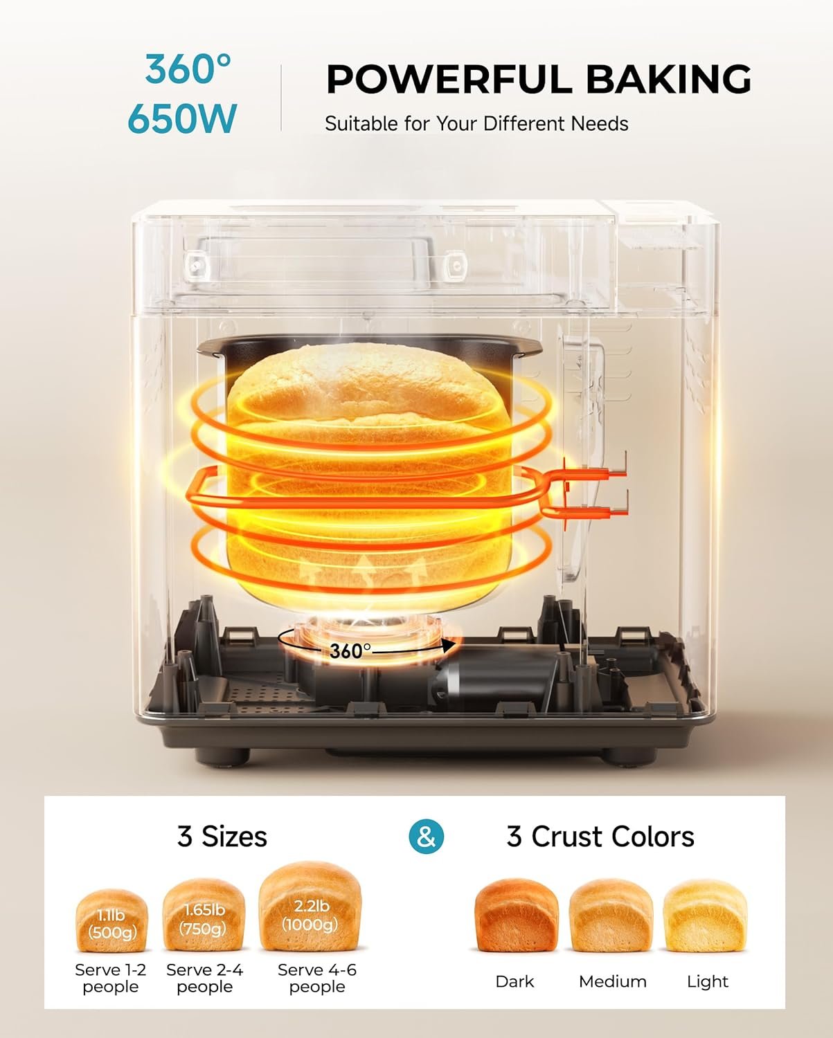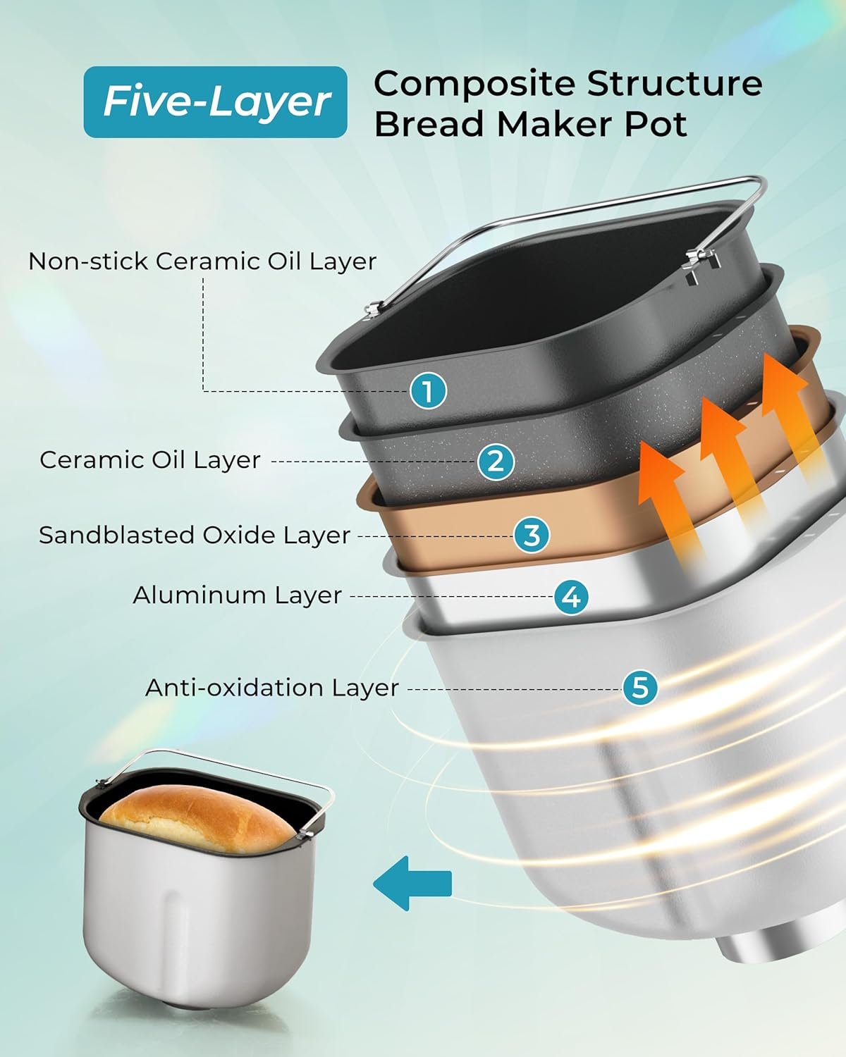 𝟔𝟓𝟎𝐖 𝐏𝐨𝐰𝐞𝐫𝐟𝐮𝐥 𝐇𝐞𝐚𝐭𝐢𝐧𝐠 & 𝐐𝐮𝐢𝐞𝐭 𝐌𝐨𝐭𝐨𝐫: Our 650W gluten-free bread machine features a powerful heating element that beats other machines, accelerates baking time, and ensures even heat distribution for perfectly golden 360° crusts with a soft, fluffy interior. Moreover, our automatic bread maker’s advanced noise reduction technology can minimize noises to 55 dB, making it an excellent choice for those who prefer to bake early in the morning or late at night
