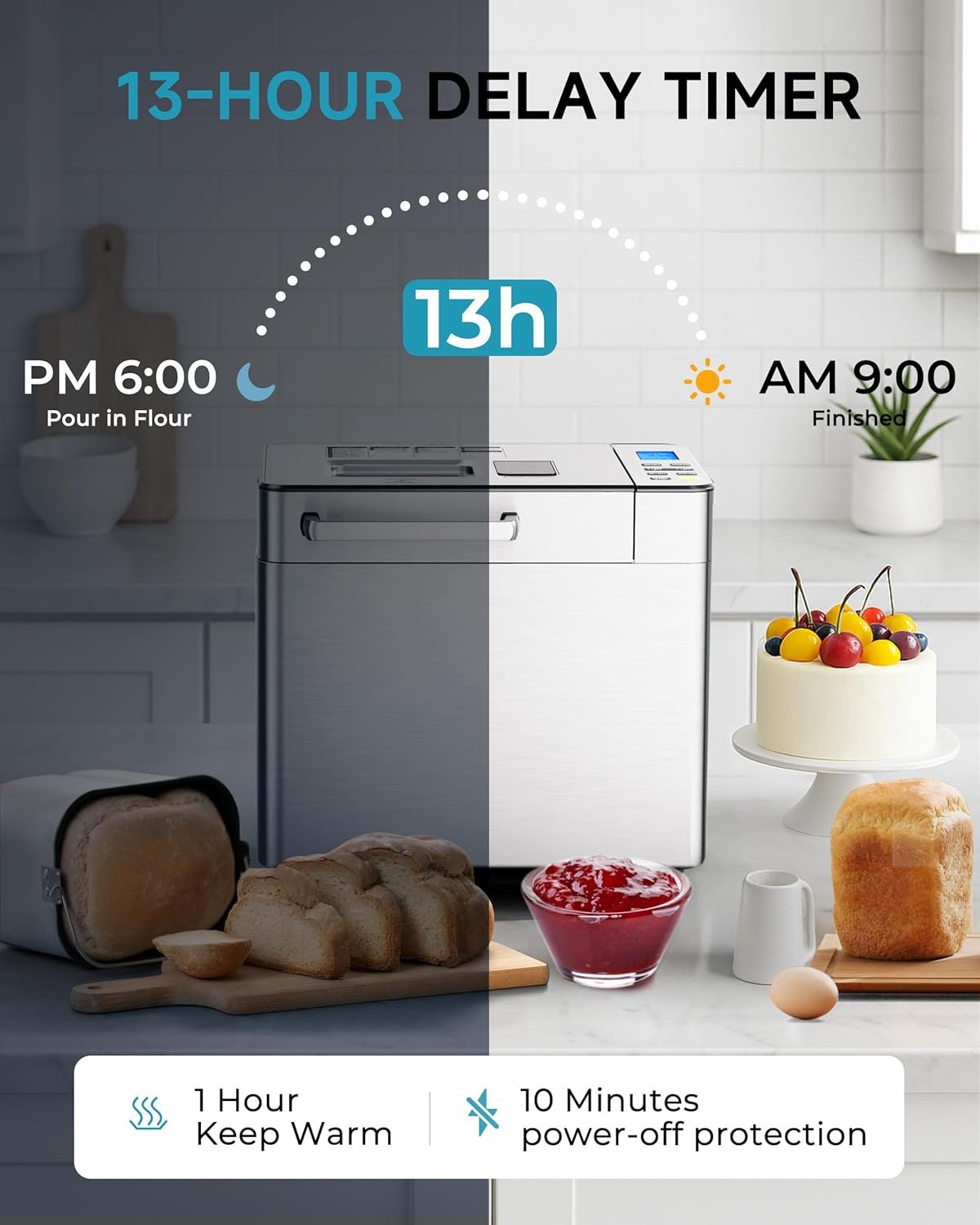 𝟏𝟑 𝐇𝐨𝐮𝐫𝐬 𝐓𝐢𝐦𝐞𝐫 & 𝐊𝐞𝐞𝐩 𝐖𝐚𝐫𝐦 𝐌𝐨𝐝𝐞: Our smart bread maker is equipped with a 13-hour delay timer, a 1-hour keep warm system, and a 15-minute power outage memory function, with our bread making machine, you can enjoy freshly baked bread anytime, whether it’s in the early morning or after work. And the digital control panel of the Euhomy small bread maker makes the operation easier and more precise