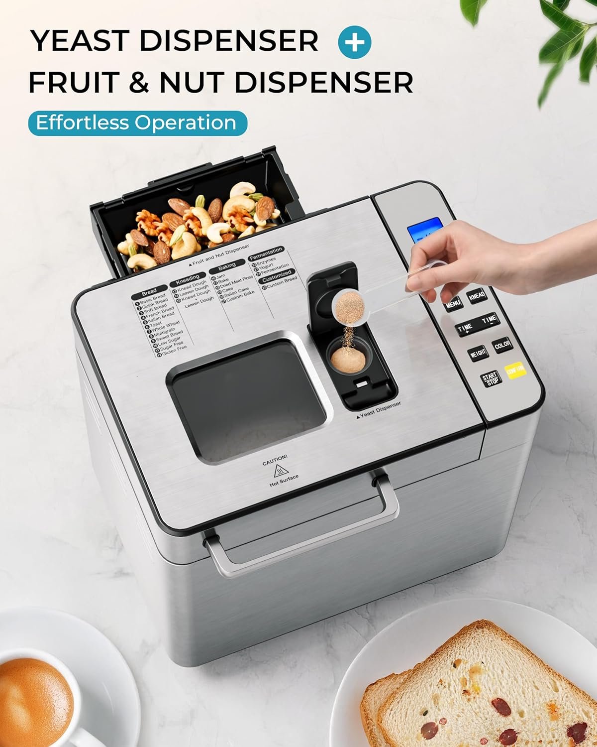 𝐈𝐧𝐧𝐨𝐯𝐚𝐭𝐢𝐯𝐞 𝐅𝐫𝐮𝐢𝐭 & 𝐍𝐮𝐭 𝐚𝐧𝐝 𝐘𝐞𝐚𝐬𝐭 𝐃𝐢𝐬𝐩𝐞𝐧𝐬𝐞𝐫𝐬: Our upgraded bread making machine now featuring both Fruit & Nut Dispenser and Yeast Dispenser, made it special among the bread machines. These dispensers can automatically release ingredients at the optimal moment, ensuring even distribution of fruits, nuts, and yeast throughout the dough. This can transform your homemade bread into a delightful treat for family and friends