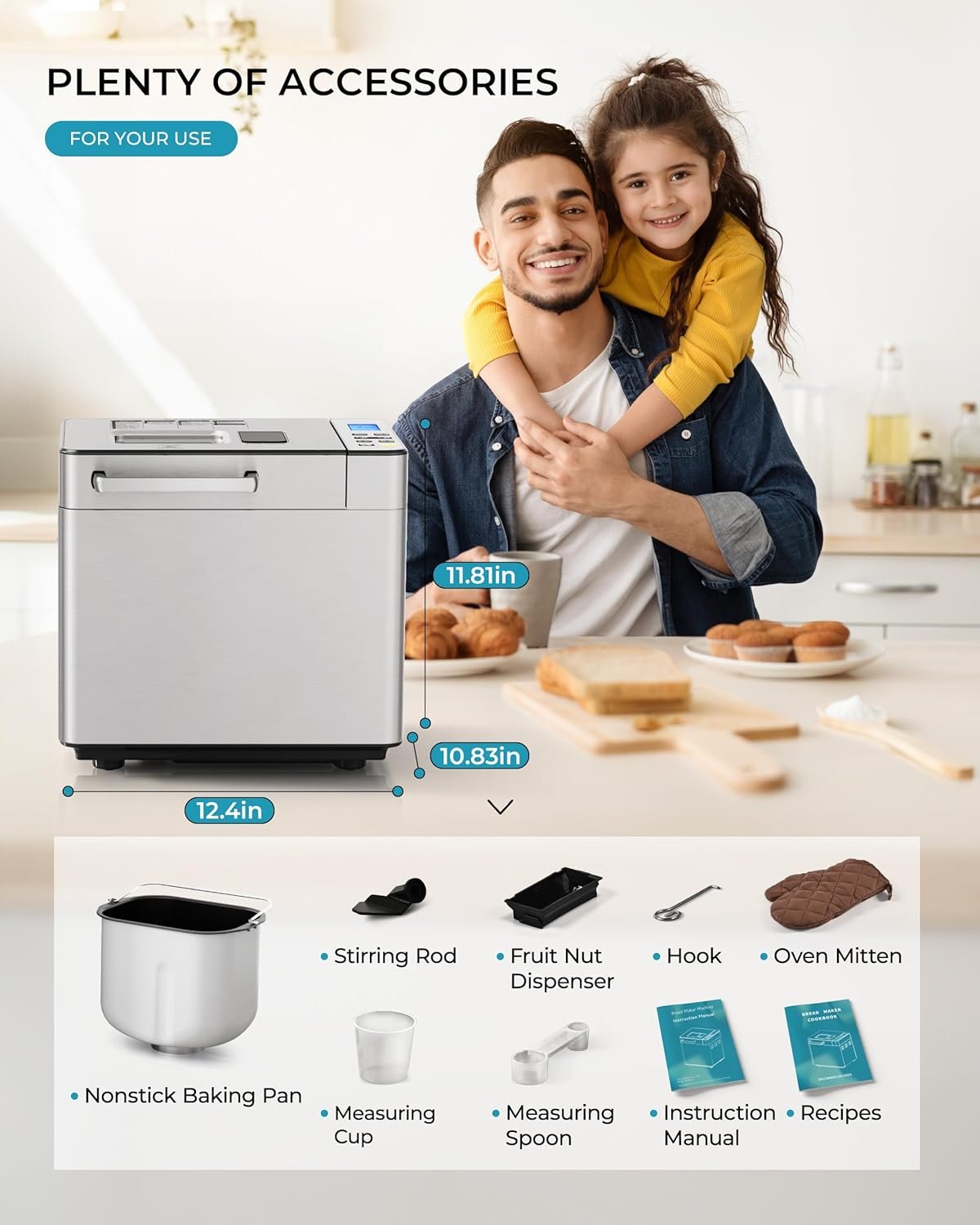 𝐎𝐭𝐡𝐞𝐫 𝐓𝐡𝐨𝐮𝐠𝐡𝐭𝐟𝐮𝐥𝐥𝐲 𝐂𝐫𝐚𝐟𝐭𝐞𝐝 𝐃𝐞𝐭𝐚𝐢𝐥𝐬: Our bread machine is UL-certified for safety and backed by a one-year warranty.The non-stick coating prevents sticking for effortless cleaning (use warm water for better results). The pan features a quick release design—simply turn and lift to remove. Both the pot and nut dispenser are dishwasher-safe, while the exterior can be wiped clean. And we provide Oven Mitt, measuring spoon and cup, hook, cookbook( for reference only) Also, please feel free to ask us any questions!