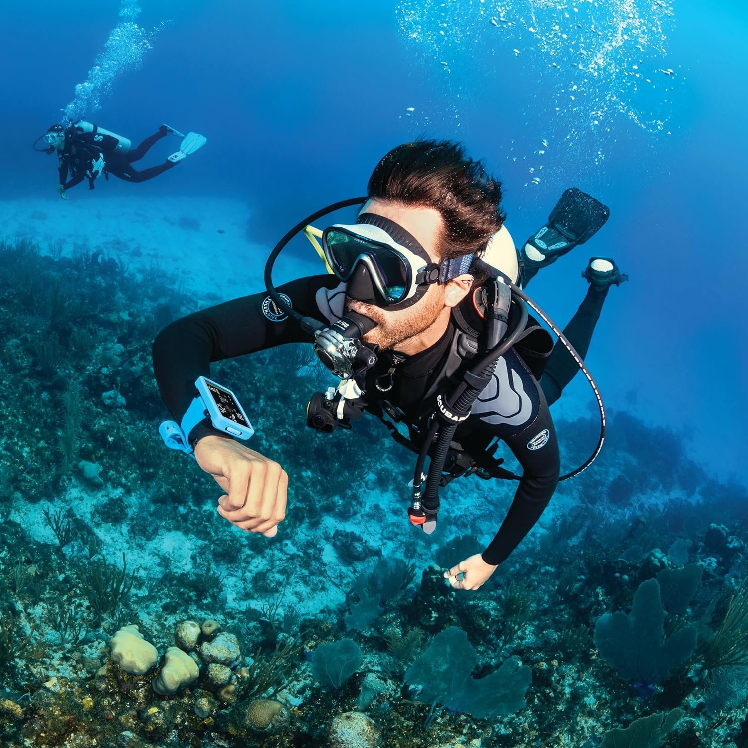 Wireless Air Integration: Monitors tank pressure and provides true remaining bottom time (RBT) calculations based on the workload from breathing.