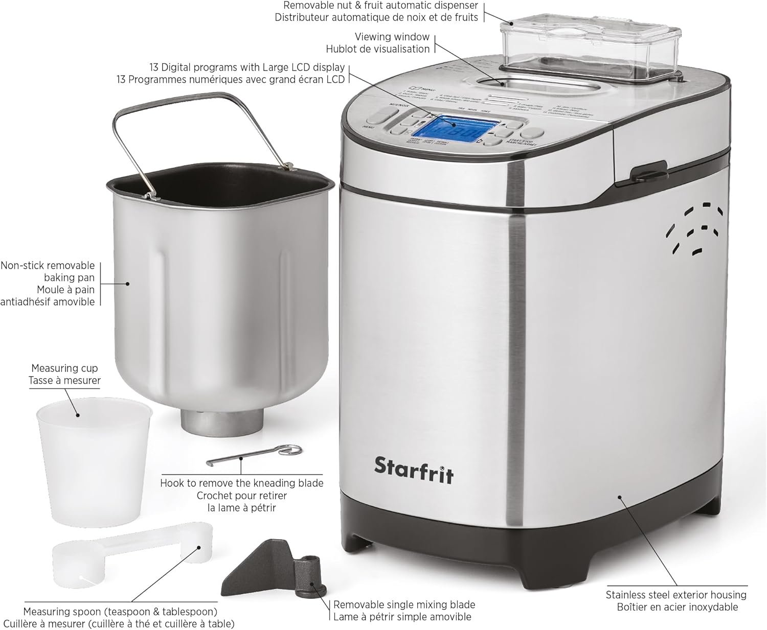 Starfrit Electric Bread Maker – 2lb Loafs – Non-Stick Removable Pan – Automatic Nut Dispenser – 13 Preset Programs – 550W