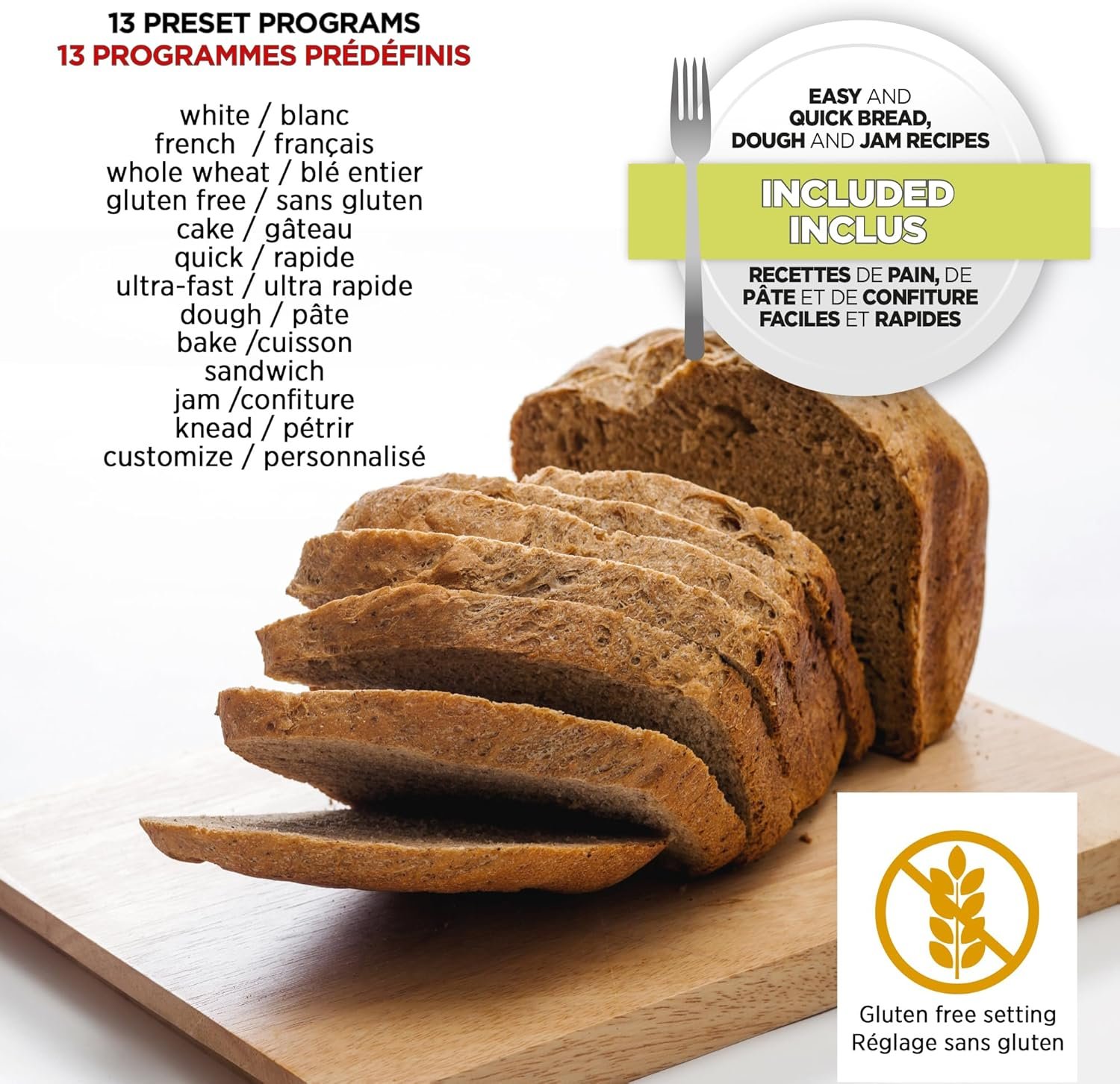 - 13 Pre-Programmed Options: Choose from a variety of baking modes, including white, quick, French, gluten-free, and more for customized bread and baked goods.